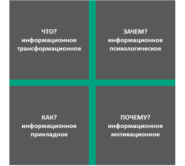 ЗАЧЕМ? это знания, объясняющие смысл выполнения определенных действий. В процессе такого обучения у сотрудников формируется понимание логики действий или происходит изменение отношения к ним. В первом случае это тоже будет информационное обучение. Во втором психологическое (разновидность трансформационного).