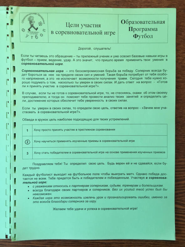 В тот момент я уже привлекался к матчам за мужскую команду, но, если честно, мне не нравилось за них выступать. Много бегаешь, а мяч у тебя над головой пролетает. Еще к тому же и проигрывали постоянно. Ребята из Образовательной Программы Футбол для меня сделали рабочую тетрадь. Вот так она выглядела: