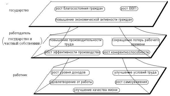 Изложенные выше экономические проблемы показывают, что для их разрешения нужны неординарные решения. Такими решениями могут быть новые принципы инвестиции в человеческий капитал. Кто же в таком случае должен быть инвестором? Как известно инвестирование предполагает вложение средств во что-то с целью получения некой выгоды. Инвестирование в человеческий капитал преследует получение для инвестора каких-то выгод как для себя непосредственно, так и для третьих лиц. Так, для работника это повышение уровня доходов, удовлетворение от работы, улучшение условий труда, рост самоуважения, улучшение качества жизни. Для работодателя это повышение производительности, сокращение потерь рабочего времени и рост эффективности производства, что в конечном итоге способствует как повышению прибыли, так и повышению конкурентоспособности фирмы на мировой арене. Для государства это повышение благосостояния граждан, рост валового дохода, повышение экономической активности граждан. В этом проявляется иерархия выгод: для работника, для работодателя государства и бизнеса и для государства в целом. Причем каждая из этих выгод расположена как бы в одной плоскости на своем уровне (рис. 1).