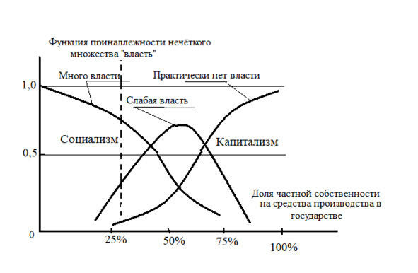 На рис. 9 показано, сколько власти в экономике при разных значениях в процентном отношении доли частной собственности на средства производства в государстве. Так при 30% частной собственности в государстве, доли власти в экономике будет «много» т.е. власть практически управляет экономикой вписана в структуру экономики. Условно на рисунке показано, что это граница социализма, а функция принадлежности может меняться при этом от 1,0 государственная собственность (поздний СССР) до 0,75 смешанная собственность (поздние соц. страны в восточной Европе). При таком соотношении будет ещё социализм, но власть может быть и слабой, и её может практически и не быть. В этом месте на рисунке необходимо строить пересечение функций принадлежности всех элементов множества. При таком соотношении будет преобладать «слабая власть». В этом направлении движется экономика Китая. Если при Мао Дзедуне и Дэн Сяопине была «сильная власть», сейчас там наблюдается «синдром китайской экономики» события на РЦБ