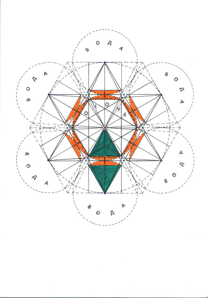 Рис. 7. Космические стихии«огонь»и«вода»в структуре биполярной сферической системы противодействующих сил Света, находящейся в фазе формирования мировых линий напряжения (монохордов) созидающих лучей (двухмерное отображение)