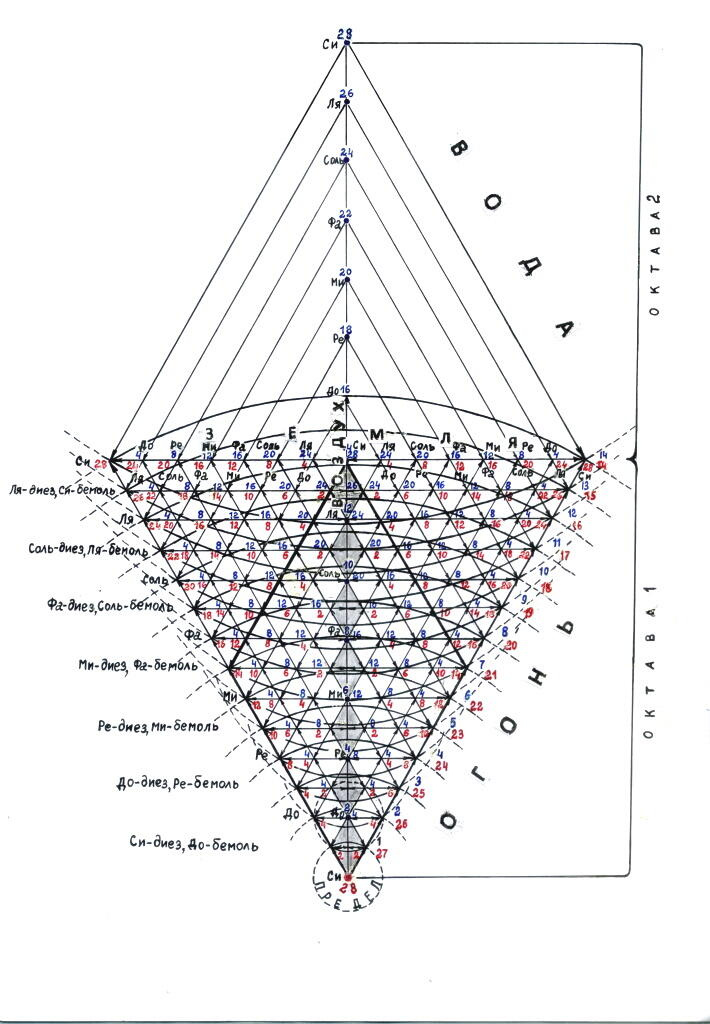 Рис. 3. Высшие космические стихии«огонь», «вода», «воздух»и«земля»в структуре напряжения созидающего луча Света (двухмерное отображение)
