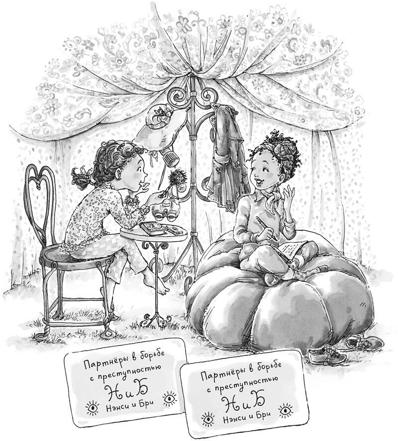 Девочки сидели у Нэнси на заднем дворе в Сыскном штабе. Они уже решили, что, когда вырастут, обязательно откроют детективное агентство. Называться оно будет «Партнёры в борьбе с преступностью». Кстати, они уже нарисовали себе отличные визитные карточки.