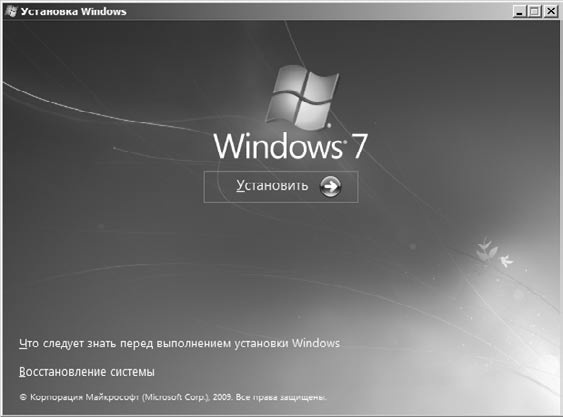 4. На следующем этапе (рис. 2.4) следует выбрать, что вы хотите сделать: инсталлировать Windows 7 или же попытаться восстановить ранее установленную систему (см. разд. 12.6). Для начала установки щелкните на кнопке Установить.