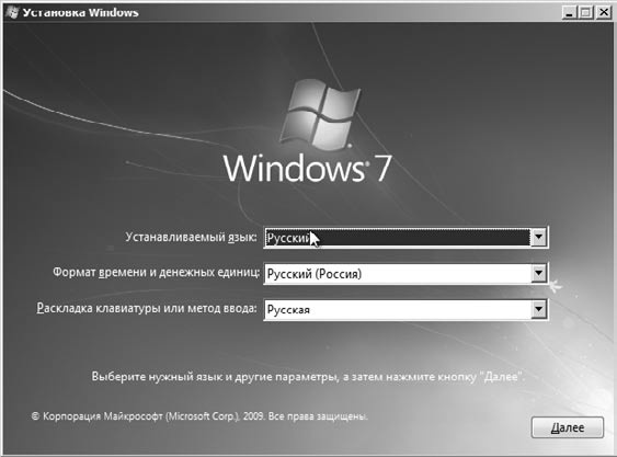 3. Дождитесь копирования файлов, необходимых для запуска программы установки, и появления первого диалогового окна (рис. 2.3). В этом окне нужно указать региональные параметры: язык установки, формат даты и времени, а также раскладку клавиатуры. После выбора всех параметров нажмите кнопку Далее.