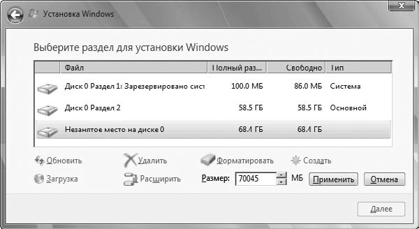 · Создать. Для создания нового раздела выделите в списке разделов незанятое место, щелкните на ссылке Создать, введите размер раздела в мегабайтах и нажмите кнопку Применить (рис. 2.8). При создании первого раздела диска будет также автоматически создан скрытый раздел для загрузочных файлов.