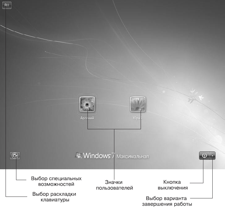 В левом нижнем углу экрана приветствия имеется кнопка Специальные возможности, с помощью которой можно включить экранную клавиатуру, режим озвучивания, экранную лупу и другие средства для пользователей с ограниченными физическими возможностями. А в правом нижнем углу экрана вы найдете кнопку для выключения компьютера. Если щелкнуть на стрелке справа от этой кнопки, можно выбрать другой способ завершения работы, например Перезагрузка или Сон. Подробнее способы завершения работы будут рассмотрены далее.