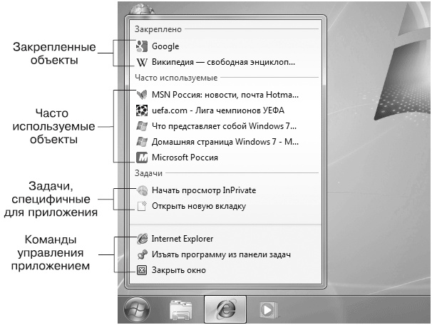 Задачи. Если программа была разработана с учетом новых возможностей Windows 7, в списке переходов могут присутствовать команды, специфичные для данного приложения. Например, для обозревателя Internet Explorer имеется две задачи: Начать просмотр InPrivate и Открыть новую вкладку.