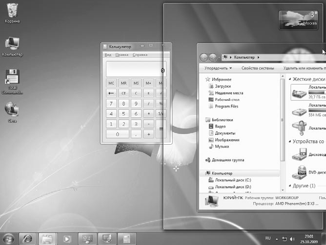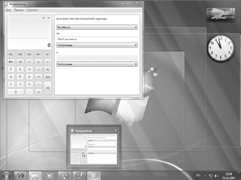 Если в процессе просмотра эскиза перевести указатель мыши с Панели задач непосредственно на эскиз, то выбранное окно отобразится в натуральную величину, а все другие окна временно станут прозрачными это так называемый эффект Aero Peek (рис. 3.9). После наведения указателя мыши на эскиз вы можете выполнить следующие действия: