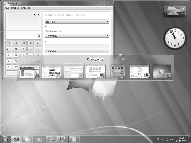 В предыдущих версиях Windows для переключения между работающими окнами можно было использовать комбинацию клавиш ALt+Tab. В Windows 7 это сочетание также используется, но в процессе переключения пользователь может видеть эскизы содержимого окон (так называемый эффект Flip), а выбранное окно при этом будет отображаться в полную величину (рис. 3.11).