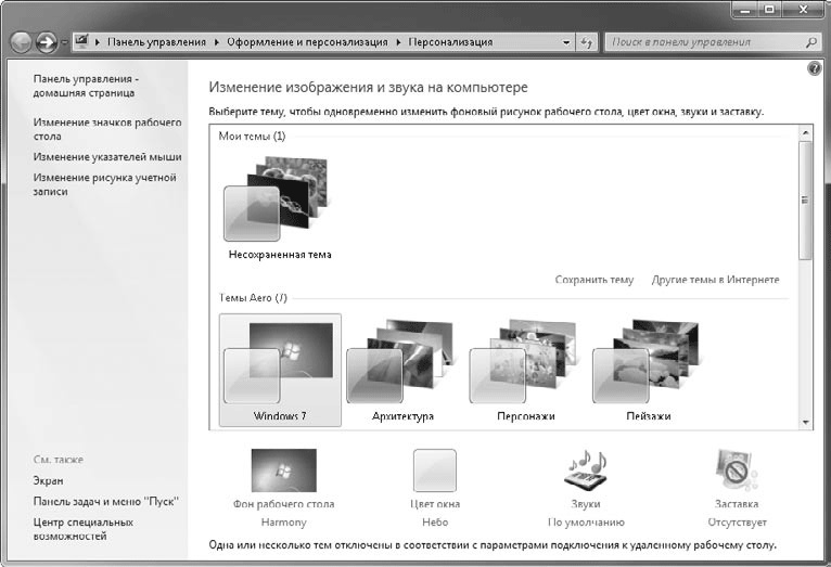 Тема Рабочего стола это набор параметров оформления, которые выполнены в едином стиле. В Windows 7 для смены темы достаточно одного щелчка на эскизе выбранной темы в окне Персонализация (см. рис. 3.13), после чего автоматически будут изменены такие элементы интерфейса, как цветовая схема, внешний вид окон, фоновый рисунок, экранная заставка, значки, системные звуки и указатели мыши.