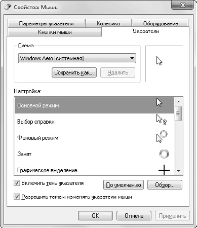 Для изменения формы указателей мыши щелкните в окне Персонализация на ссылке Изменение указателей мыши. При этом откроется вкладка Указатели диалогового окна Свойства: Мышь (рис. 3.19).