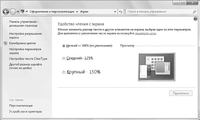 Чтобы добиться наивысшего качества изображения на мониторе, необходимо правильно настроить параметры дисплея. Для этого щелкните на ссылке Экран в окне Персонал изация. В появившемся окне (рис. 3.21) вы сможете настроить размер шрифтов и другие параметры изображения.