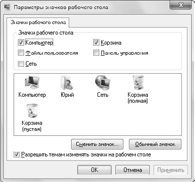 Вы можете открыть окно настройки значков Рабочего стола, щелкнув в окне Персонализация на ссылке Изменение значков рабочего стола, которая находится в левой части окна. В появившемся окне можно включать или отключать отображение на Рабочем столе значков Компьютер, Файлы пользователя, Сеть, Корзина и Панель управления (рис. 3.20).