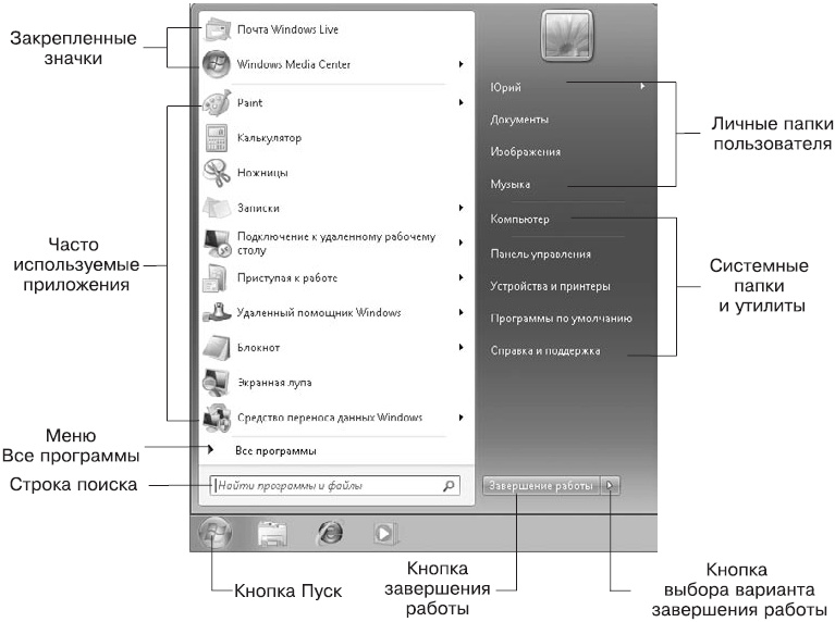 Меню Пуск (рис. 3.25) состоит из двух колонок: в левой находятся строка поиска и ярлыки часто используемых программ, а в правой ссылки для открытия личных папок пользователя, системных объектов и утилит.