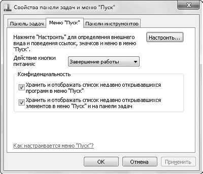 Чтобы открыть окно свойств меню Пуск, щелкните правой кнопкой мыши на кнопке Пуск и выберите в контекстном меню пункт Свойства. При этом откроется окно, показанное на рис. 3.27.