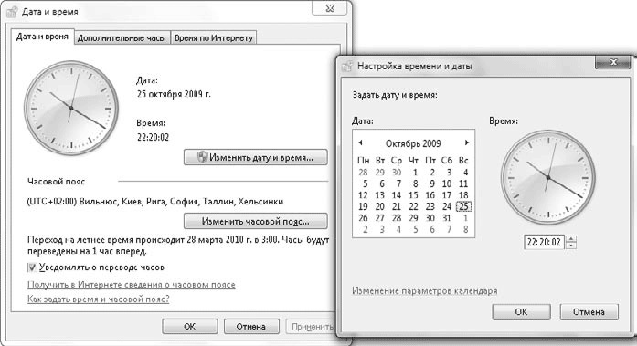 Для настройки даты и времени щелкните правой кнопкой мыши на значке часов в области уведомлений и выберите пункт Настройка даты и времени. Чтобы изменить показания часов или текущую дату, нажмите кнопку Изменить дату и время (для этого нужны права администратора). В появившемся окне вы сможете указать на календаре нужную дату (рис. 3.38). Для смены месяца щелкните на названии текущего месяца, а повторный щелчок позволит перейти к выбору года. Чтобы изменить время, щелкните в поле с показаниями времени, после чего используйте кнопки с изображением стрелок и . После установки правильных значений даты и времени нажмите OK.
