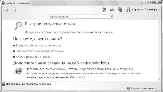 Как уже отмечалось выше, Windows 7 имеет мощные встроенные возможности поиска, которые можно использовать и в справочной системе. Просто введите в строку поиска ключевые слова темы, по которой вам нужна справка, и после нажатия клавиши Enter вы получите ссылки на результаты поиска.