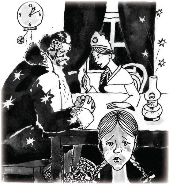 На военный совет Мороз Иваныч пригласил ратников и Работника Балду к себе в избу. В ней было студёно. По углам лежали небольшие сугробы снега, а мебель являла собой тускло мерцающие ледяные глыбы. Но о том, что обсуждалось на совете, мы говорить не имеем права, так как совет был тайный. А военная тайна это самый большой секрет! Совет закончился далеко за полночь, когда на дворе наступила непроглядная темнота. Служилые люди разошлись по домам, хозяева избы уже легли спать, но спустя некоторое время в дверь к Морозу Иванычу тихо постучали.