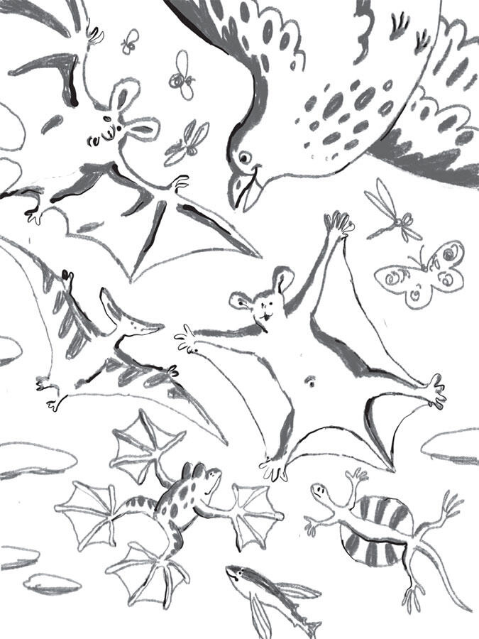 Во-вторых, для того чтобы удерживать перепонку натянутой между конечностями, все-таки требуется их распрямлять. Кажется, что с выпрямлением конечностей у всех животных долгое время было не очень хорошо. Но это «не очень хорошо» распространялось только на прямую постановку конечностей под туловищем распрямлению и вытягиванию приставленных к туловищу по бокам конечностей это никак не должно было помешать вроде бы. Оно, разумеется, так, но не совсем: для поддержания конечностей в распрямленном состоянии, как уже сказано, требуется постоянное напряжение мышц, и можно предположить, что животное, справляющееся с этой задачей, может лучше справиться и с натяжением перепонки и между конечностями. И сегодня ящерицы с ногами под туловищем встречаются разве что в сочинениях фантастов это же требует долгого, непрекращающегося напряжения (как и для поддержания конечностей в выпрямленном состоянии), а это, в свою очередь, требует более активного метаболизма, чем тот, которым обладают существа «рептильного устройства». Впрочем, это всего лишь мои размышления на тему.