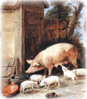 Свинья очень некрасива с виду, любит валяться в грязи и рыться в сору, ленива, неповоротлива, прожорлива и неразборчива в пище. Вот почему самое имя свиньи звучит как-то неприятно. Но, тем не менее, люди держат и откармливают свиней очень охотно. Питаясь полусгнившими листьями капусты, испортившимся картофелем, помоями, желудями, травой, корнями растений, словом, всякого рода растительной и животной пищей, свинья быстро растет, толстеет, покрывается большим слоем жира. Вся ее толстая туша идет в пищу, а из крепкой щетины делают щетки и кисти для красильщиков. Вот почему бедняки, которые не в силах содержать ни коровы, ни лошади, держат свиней, прокармливая их всякими остатками от своего бедного хозяйства.