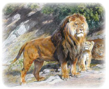 Лев, которого по его величественному виду, громадной силе, страшному голосу назвали царем зверей, бывает обыкновенно серо-желтоватого цвета, до сажени в длину и аршина полтора в вышину. У него на конце длинного хвоста большой пучок волос, а на шее длинная, косматая грива; у львицы гривы нет. В древние времена лев жил и в южной Европе, теперь в Европе он бывает только в зверинцах. В диком состоянии лев водится в Африке и Южной Азии. Самые большие львы встречаются в Персии. Лев, как говорят, кидается на человека только голодный и раздраженный.