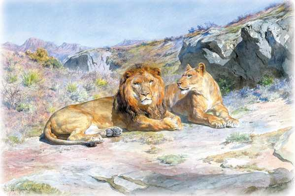Чтобы судить о силе этих животных, довольно сказать, что лев одним ударом лапы может перебить крестец у лошади и уносит быка, как волк ягненка. Он выступает величаво, но, кидаясь на добычу, делает прыжки сажени в четыре. Вот почему, когда посреди ночи в пустыне раздается страшный рев льва, то все живое трепещет и спешит укрыться. Тигр не многим уступает льву в силе, а дерзостью и кровожадностью далеко превосходит его.