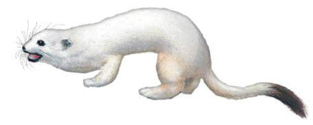 4) Горностай зимою также весь белый, кончик хвоста черный, похож на ласку, но мех пушистее, теплее и ценится дорого. Заметим кстати, что куницу, соболя, горностая и ласку считают различными видами одного и того же куньего рода.