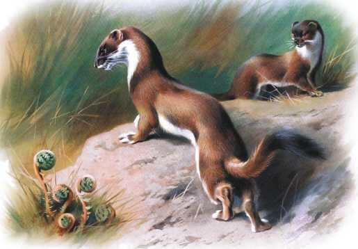 3) Ласочка, или ласка, зимою вся белая, изредка попадается даже в наших северных деревнях, вырывая норы под полами домов. Хотя она тоже хорек и также душит цыплят, но наши деревенские хозяйки очень ее любят за прекрасную белую шкурку и за то еще, что она сильно истребляет мышей.