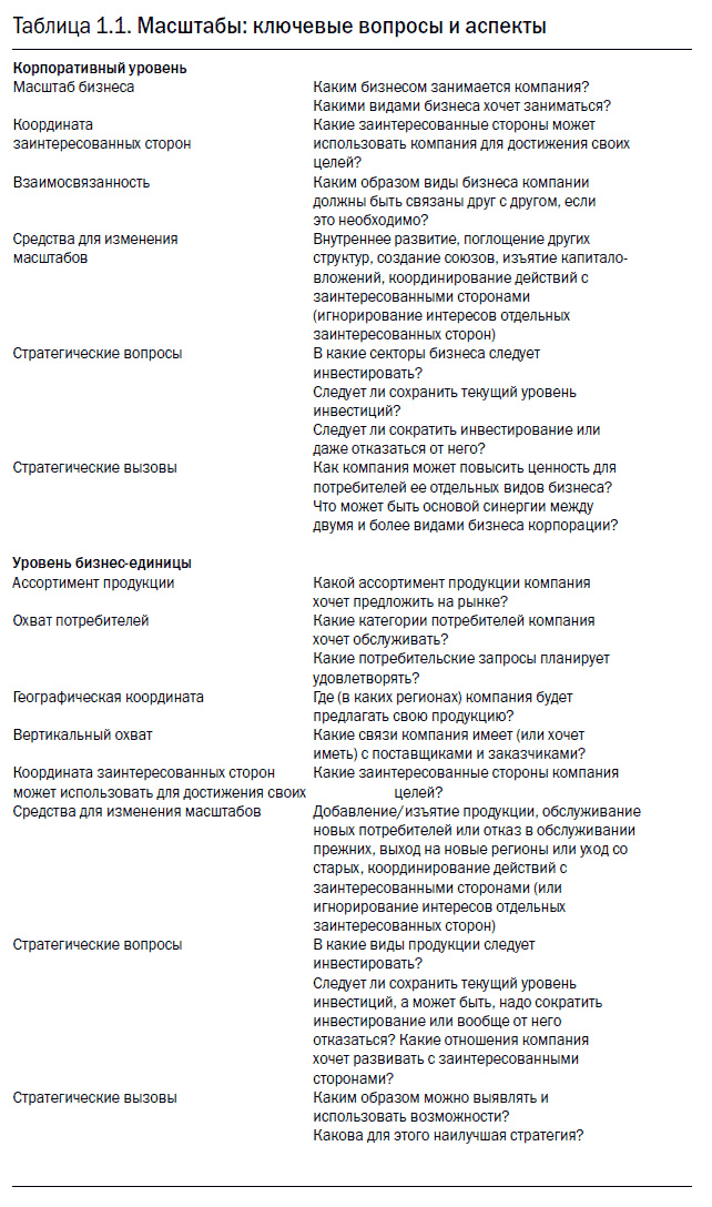 Для любой стратегии вопросы, связанные с масштабами бизнеса, центральные. Решения о масштабе деятельности помогают организации понять ограниченность даже доступных для нее вариантов. Ни одна компания не может предложить на рынке неограниченный выбор продуктов или столь же широкий уровень обслуживания. И даже при помощи партнеров большинство компаний не может охватить всех потенциальных потребителей. Действительно, только немногим удается вести конкурентную борьбу или «быть игроком» во всех сегментах своей отрасли. Поэтому при определении масштаба организация выбирает «игровую площадку», в наибольшей степени соответствующую ее запросам, где ее конкурентные преимущества наибольшие.