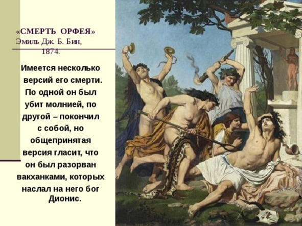 Вторые, кто не мог справится со своим характером (норовом) и настойчиво продолжали учить других жизни заканчивали плачевно. Тут можно вспомнить растерзанного Орфея. В зрелом возрасте он стал проповедовать поклонение природе, написал гимны наукам физике и астрономии.