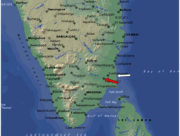 Танджор (красная стрелка), Карикал (белая стрелка)