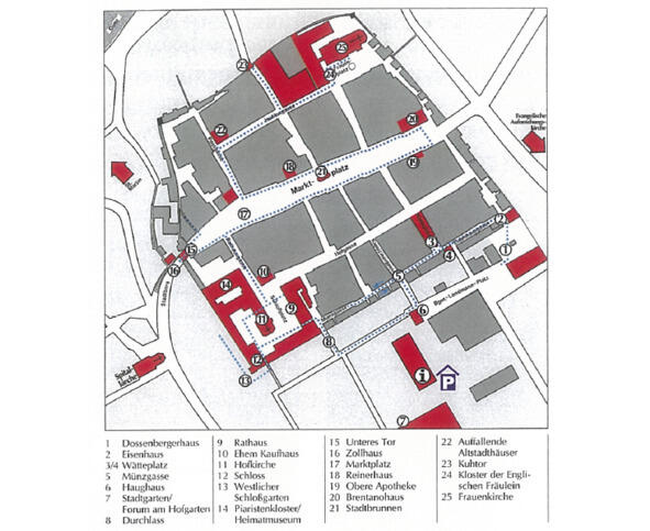 Гулять по городу можно ориентируясь по карте с нанесенными цифрами. В качестве исходной точки предлагается Доссенбергерхаус (номер 1 на плане города): казарма второй половины 18 века. В её дворе изначально муштровались солдаты, которые затем отправлялись для участия в боях против турок и французов.