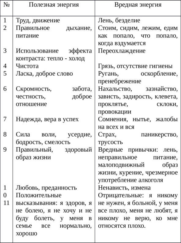 Каждый перечисленный фактор, выражение, слово, взгляд имеют свою энергетику, свой потенциал, который влияет на собственную и на чужую сторону. Полезная способствует выздоровлению, вредная способствует заболеванию.