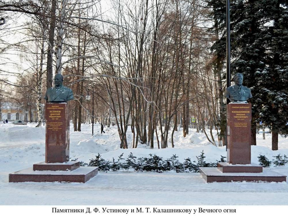 Рядом с Вечным огнём находится стела с изображением солдат, сталевара и матери, прижимающей к груди сына. С другой стороны от него памятные доски с именами Героев Советского Союза, полных кавалеров Орденов Славы и с перечислением воинских подразделений, сформированных на территории Удмуртии во время войны. А ещё два бюста: известному конструктору Михаилу Тимофеевичу Калашникову, создателю всемирно известного автомата Калашникова, и маршалу СССР Дмитрию Фёдоровичу Устинову, курировавшему производство оружия в Ижевске и часто здесь бывавшему.