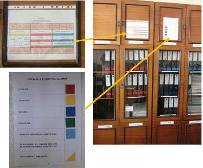 Для офиса может быть применено различное упорядочивание папок, визуализация, цветовая маркировка, перечни, подписи, разделение по категориям.