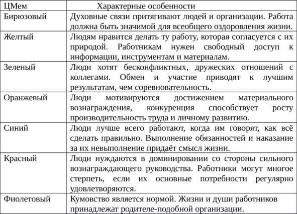 Если уважаемый читатель ранее не погружался детально в мир спиральной динамики, то рассмотрим основные уровни спиральной динамики по Дону Беку и Крису Кован, изложенные в книге «Спиральная динамика». Эти авторы отмечают, что спиральное мастерство предполагает управление всем спектром цМемов. Понятие «цМем» отражает мировоззрение, систему оценивания, уровень психологического существования, структуру веры, организующий принцип, способ мышления либо метод приспособления. Он представляет собой, во-первых, основные понятия, которые формируют системы и направляют поведение человека. Во-вторых, он оказывает воздействие на все жизненные выборы в качестве основы для принятия решений. В-третьих, каждый цМем может проявляться как в здоровой, так и нездоровой форме. В-четвертых, цМем представляет собой дискретную структуру мышления, а не просто набор идей, ценностей или мотивов. В-пятых, с изменением условий жизни (состоящих из исторических времен, географического места, экзистенциальных проблем и социальных обстоятельств) он может загораться ярче или тускнеть [2]. Создание адекватного соответствия людей и работ, например, влечет за собой все нижеследующее сразу (таблица 1).