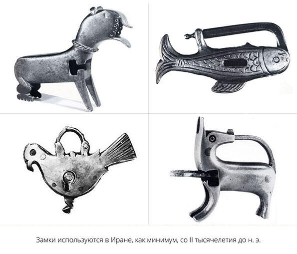 Замки используются в Иране, как минимум, со II тысячелетия до н. э. Самый древний замòк из обнаруженных в Персии (XIII в. до н. э.) найден внутри знаменитого зиккурата Чока-Занбиль (провинция Хузестан).