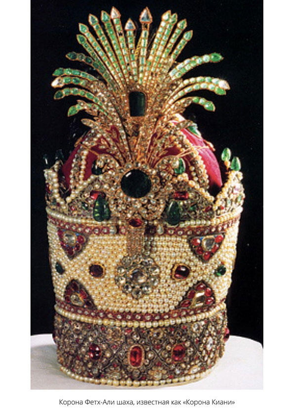 Корона Фетх-Али шаха, известная как «Корона Киани» украшена бриллиантами, изумрудами, рубинам и жемчугом. Основный красный камень корунд Аурангзиб. Корону изготовили во времена правления Фетх-Али шаха, в 1797 г., и ею пользовались несколько шахов после него. Она стала первой короной, изготовленной в Иране после падения Сасанидов под натиском арабов-мусульман.