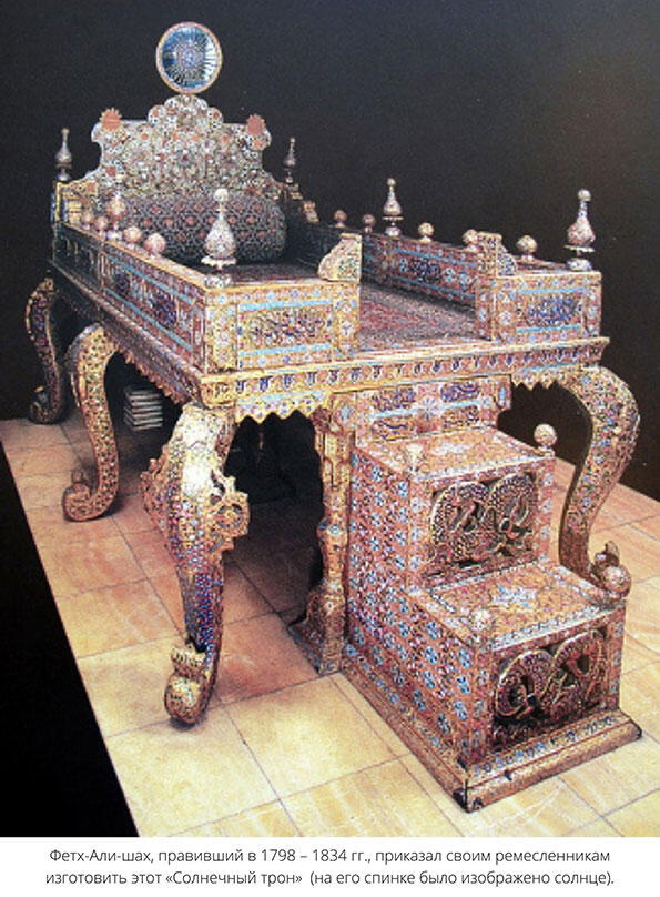 Фетх-Али-шах, правивший в 1798 1834 гг., приказал своим ремесленникам изготовить этот «Солнечный трон» (на его спинке было изображено солнце). После того как шах женился на Тавус («Павлин») Таджодоле, трон переименовали в «Павлиний». Некоторые считают его знаменитым «Павлиньим троном», привезенным из Индии, но это не так.