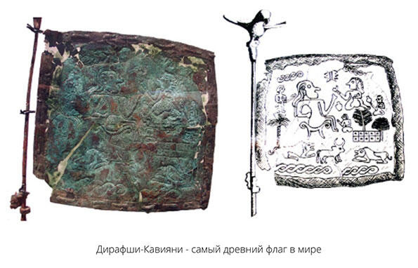 Самым старым из поныне используемых государственных флагов справедливо считается флаг Дании (утвержден в 1219 г.). Однако и Ирану есть, чем похвастаться именно на его территории был обнаружен, предположительно, самый древний из физически сохранившихся штандартов/флагов. Его обнаружили в 1970-х годах, когда ученые начали раскопки в окрестностях города Шехдад, неподалеку от Кермана (юго-восточный Иран). Тогда, посреди раскаленной пустыни Деште-Лут, был обнаружен целый древний город, существовавший в этих местах в начале III тысячелетия до н. э.