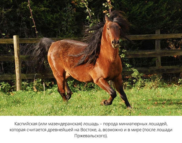 Каспийская (или мазендеранская) лошадь порода миниатюрных лошадей, ведущих свое происхождение из Ирана, которая считается древнейшей на Востоке, а, возможно и в мире (после лошади Пржевальского). Утверждения о том, что каспийская лошадь является старейшей из одомашненных лошадей, сохранившихся до наших времен, появились после обнаружения в 2011 году останков коня этой породы, датирующихся 3400 г. до н. э., в Гохар-Теппе (провинция Мазендеран).