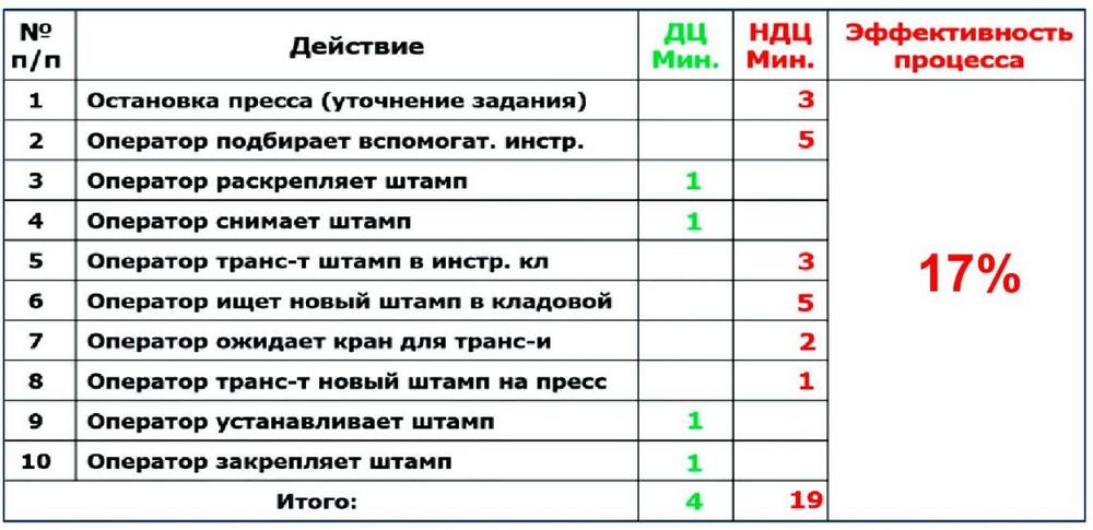 Перед вами типичный случай замены штампа на небольшом прессе. Обратите внимание на действия, из которых состоит переналадка. Каждое действие прохронометрировано по времени и классифицировано по принципу «ценность потеря». Ценностью, т.е. тем, за что Заказчик готов платить деньги, в данном случае считаем поменянный в кратчайшие сроки штамп. Таким образом, ценностью будут являться только действия, которые связаны с физической заменой штампа: раскрепили, сняли, поставили, закрепили.