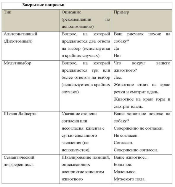 Таблицы можно продолжать и продолжать. Самое главное в постановке вопросов это не навязывать свою точку зрения и не давать клиенту вариант для ответа, а может быть, вообще не давать ответа, пусть он сам даст ответ, только не «да», «нет», а описательный ответ.