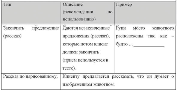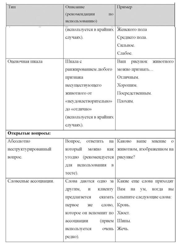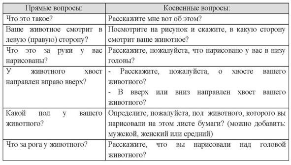 Необходимо с самого начала формулирования вопросов обязательно подбодрить клиента, может быть, такой фразой: «Мне очень нравится, как вы нарисовали животное!» В последующем обсуждении рисунка необходимо говорить подбадривающие слова: «да», «хорошо», «очень хорошо», «отлично».