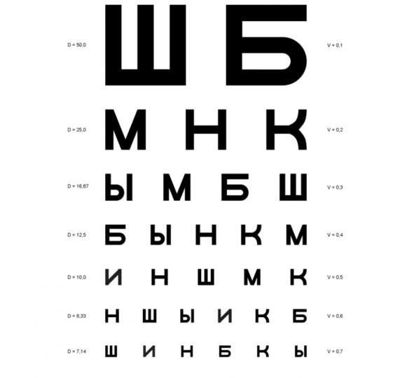 Так, задерживаясь на каждой строке (фокусируя взгляд на отдельной букве) по 3 секунды, дойти до последней различимой строки.