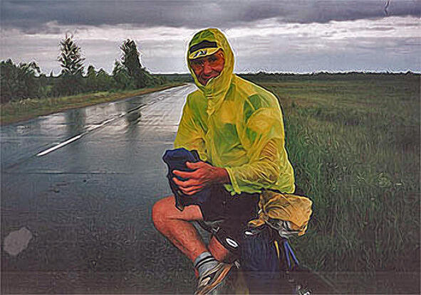 Чтобы не потеть, пришлось раздеваться. Нам, на тандеме, проще. Снимаем всё дождевое, не останавливаясь. Людмиле вообще легко, ей можно руками не держаться за руль без всякого риска. Мне же, она помогает снять куртку во время движения.