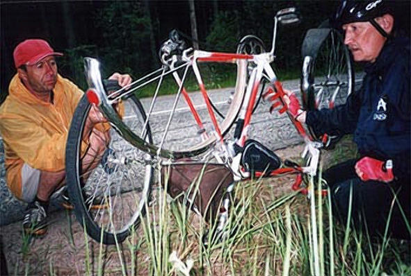 Слышим, как застучало колесо у Сергея. Прокол на такой хорошей дороге! Останавливаемся. Помогаю Сергею поменять камеру. Причина прокола кусочек тонкой проволоки от корда автомобильной шины.