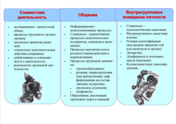 2. Динамика групповой жизни (групповые социально-психологические процессы деятельности, общения и внутри коллективного поведения отдельных членов коллектива) (см. таблица 1).
