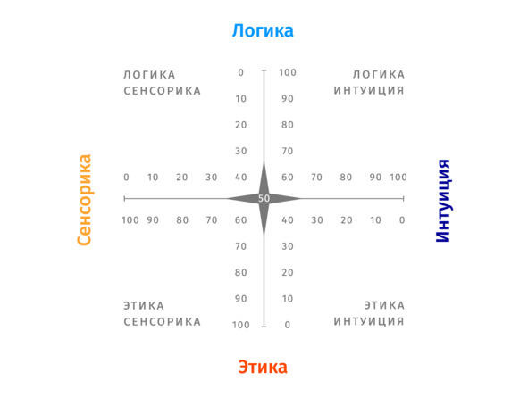 Особенности восприятия и обработки информации каждого отдельного человека можно отобразить одной точкой. Спроецировав эту точку на систему координат, можно описать, как конкретный человек получает и как он обрабатывает полученную информацию. Верхний левый квадрант это люди, которые получают информацию сенсорно, через органы чувств, а обрабатывают её логически. Нижний левый квадрант это получение информации сенсорно, но обработка её этически, чувственно-эмоциональным способом. Верхний правый квадрант это интуитивное получение информации и логическая обработка, а нижний правый это получение информации интуитивным путём и чувственно-эмоциональная обработка информации.